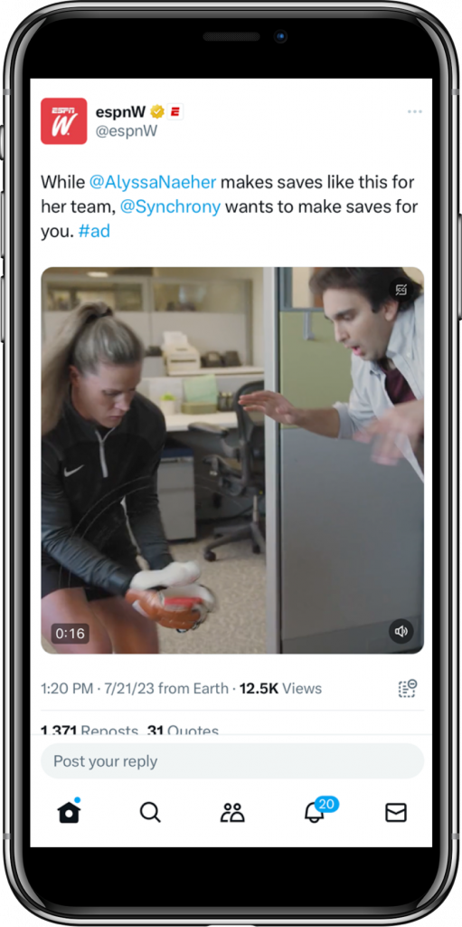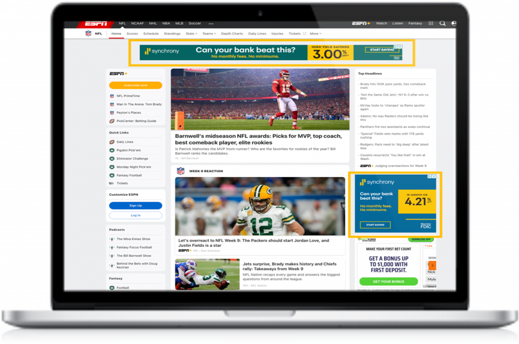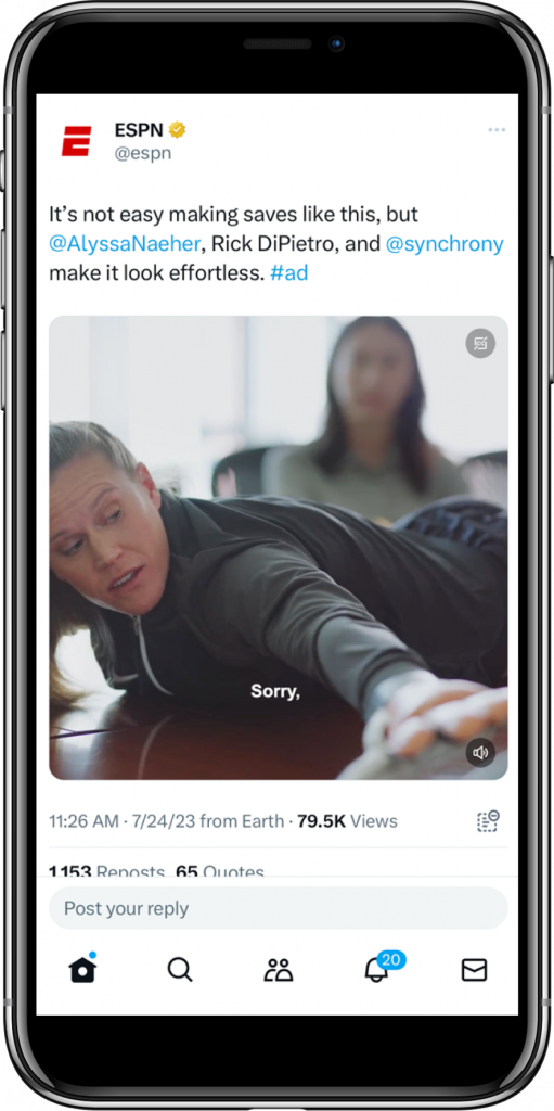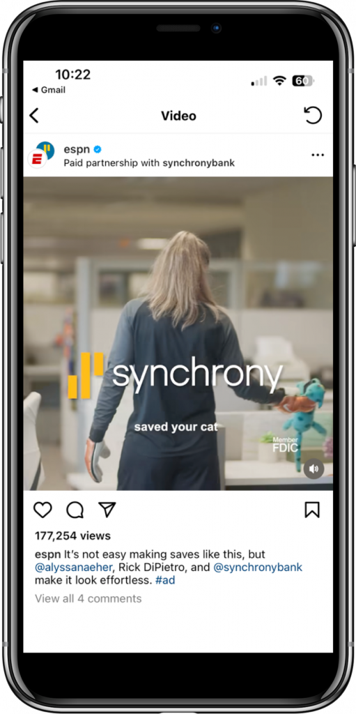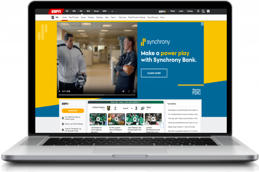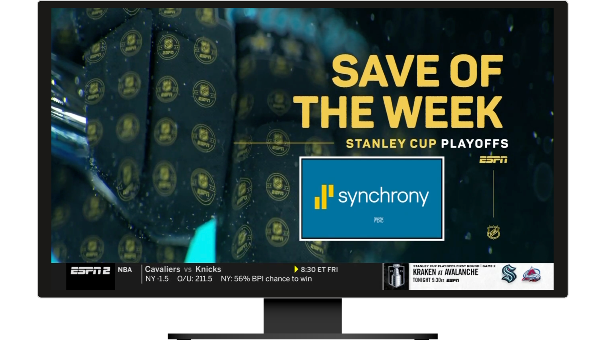 Synchrony had an always-on NHL media presence in 2023 that spanned in-game, NHL studio coverage, NHL’s page on ESPN.com, and Hulu. These strategically selected places combined with custom creative made meaningful impact on NHL fans, especially during the playoffs when the spots premiered in linear coverage among epic rivalries.